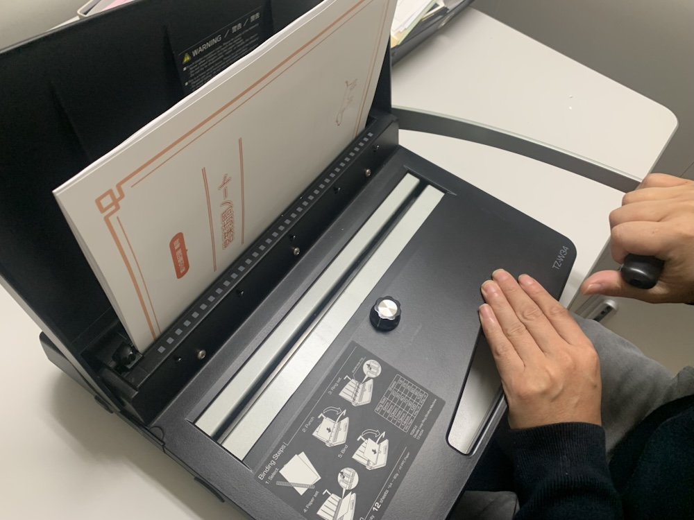 ③印刷→まさかの手動で穴あけとリング通し※冊子数が少量の場合のみ。数が多いと協力会社のデカい機械でバチコンやってもらいます。