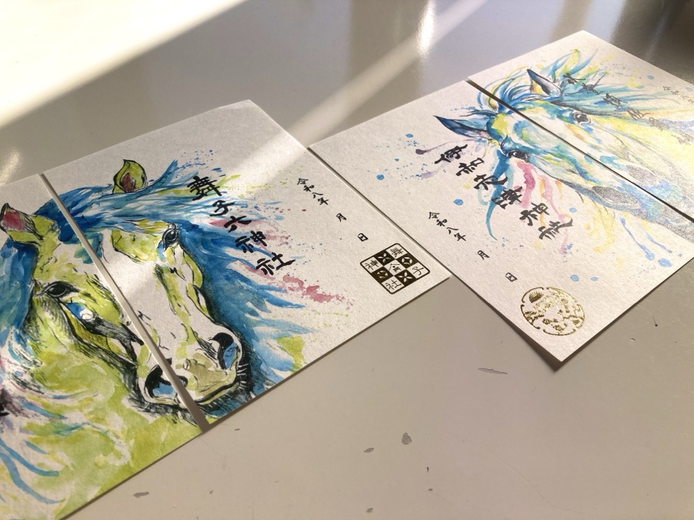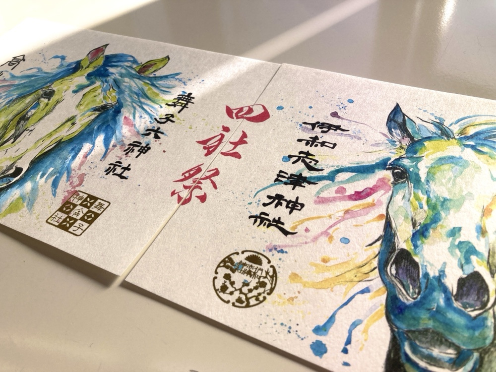 こちらは4枚集めると、2頭の馬が繋がるイラストと四社それぞれの印が箔押しされていて、素敵な御朱印が完成します!
