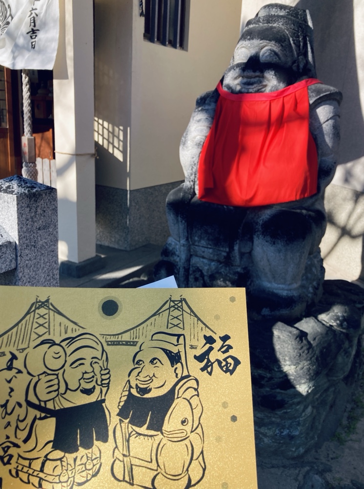 境内にあるえべっさんや大黒さんの石像をモチーフにした御朱印を受けて(イラスト描きました)、新しくなったおみくじを引いて(編集&印刷しました)、地元のちょっとした屋台で和菓子をお土産に購入。